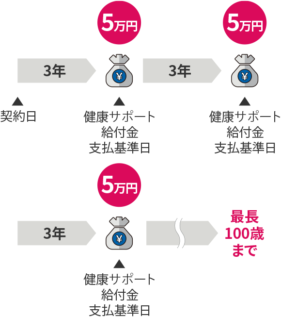 健康サポート特則を付加した場合、3年ごとに病気・ケガによる短期疾病入院一時金、短期災害入院一時金のお支払いがなければ、最長100歳まで、3年ごとに5万円が受け取れます。