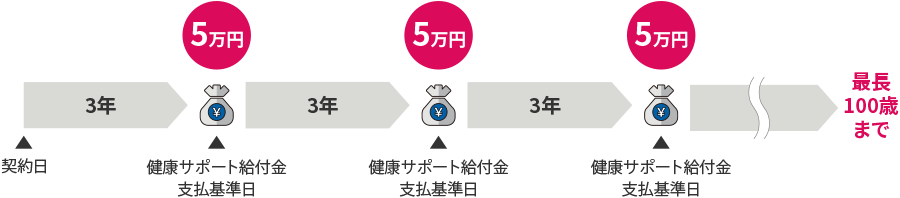 健康サポート特則を付加した場合、3年ごとに病気・ケガによる短期疾病入院一時金、短期災害入院一時金のお支払いがなければ、最長100歳まで、3年ごとに5万円が受け取れます。