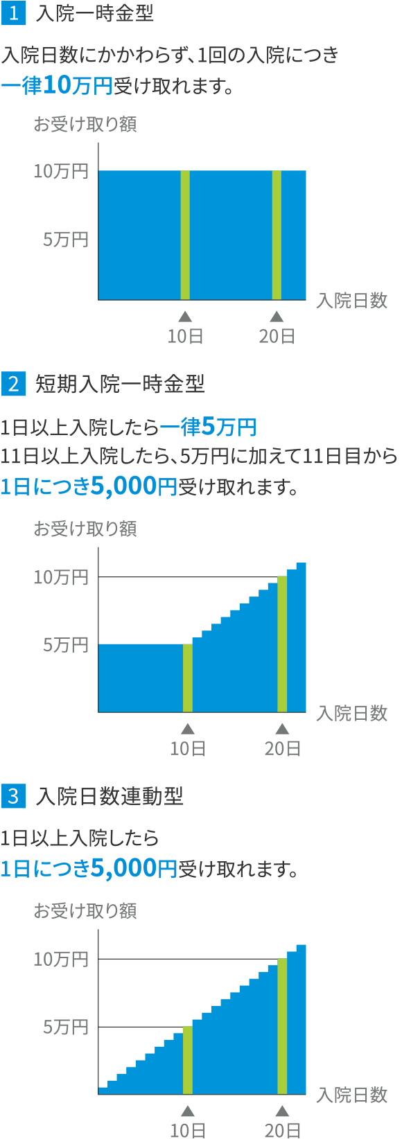 - 主契約の疾病・災害入院給付金等が支払われる期間(主契約が入院一時金型の場合は、実際の入院期間ではなく、入院を開始した日からその日を含めて20日間)はお支払いしません。