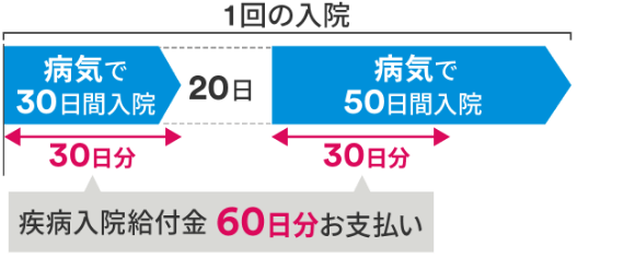 疾病入院給付金が支払われることとなった最終の入院の退院日の翌日からその日を含めて60日以内に開始した入院は、それらの入院が同一の原因であるか否かにかかわらず、「1回の入院」として取り扱います。