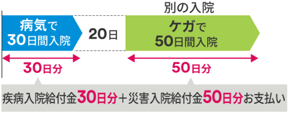 疾病入院給付金が支払われる入院と災害入院給付金が支払われる入院を「1回の入院」として取り扱うことはありません。