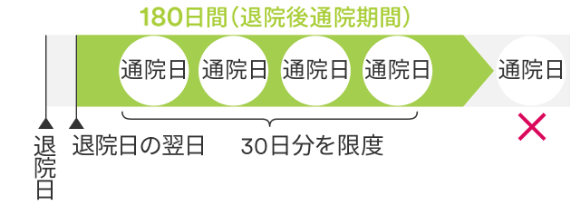 退院日の翌日からその日を含めて180日以内の期間(退院後通院期間)の通院について、退院後通院給付金をお支払いします。