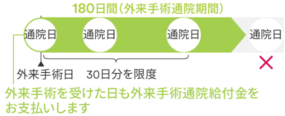 所定の外来手術を受けられ、外来手術を受けられた日からその日を含めて180日以内にその原因となった病気やケガの治療のために通院されることを要します。
