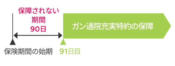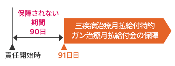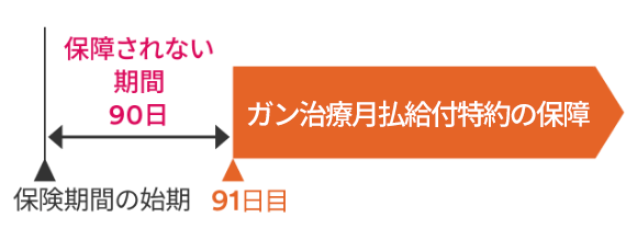 この特約のガン治療月払給付金の保障は、この特約の責任開始時の属する日からその日を含めて91日目(ガン責任開始日)から保障を開始します(90日間の保障されない期間があります)。