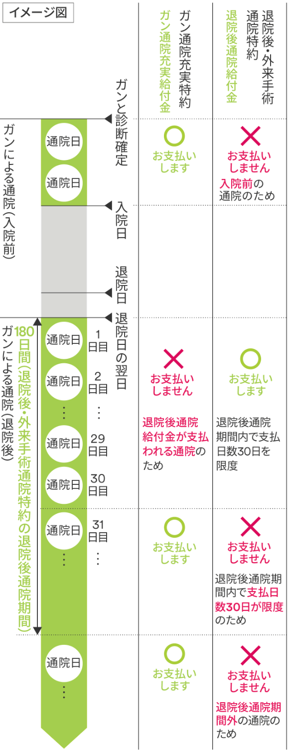 - 退院後・外来手術通院特約の各給付金が支払われる通院の日を除きます。
